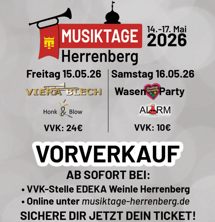 Ab sofort läuft der reguläre Vorverkauf für die Musiktage Herrenberg hier in unserem Online-Shop , sowie bei der VVK-Stelle E-Center Weinle in Herrenberg.
